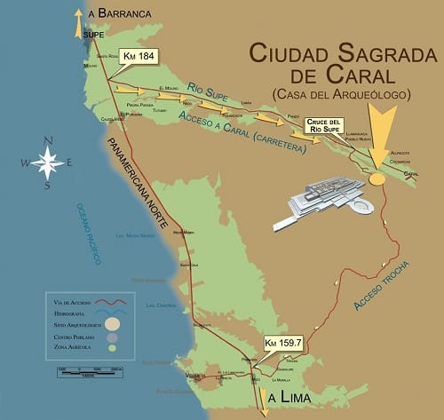 En toda esta área destaca claramente el valle de Supe, ubicado en la provincia de Barranca, departamento de Lima, donde en apenas 40 kilómetros desde el mar, se han identificado 20 asentamientos de esta civilización, 1 cuyas extensiones van de 0,16 hectáreas hasta casi 80 hectáreas.2 Ocho de ellos son los de mayor tamaño, entre los que destaca nítidamente por su complejidad la ciudad sagrada de Caral, de la que deriva el nombre de la cultura. Fue, sin duda, la capital de la región. Los otros asentamientos con construcciones monumentales son Pueblo Nuevo, Cerro Colorado, Allpacoto y Llapta (en la margen derecha del Supe); y Lurihuasi, Miraya y Chupacigarro (en la margen izquierda).3 En el litoral cercano a la desembocadura del Supe destaca Áspero, que fue según todos los indicios la ciudad pesquera de Caral.